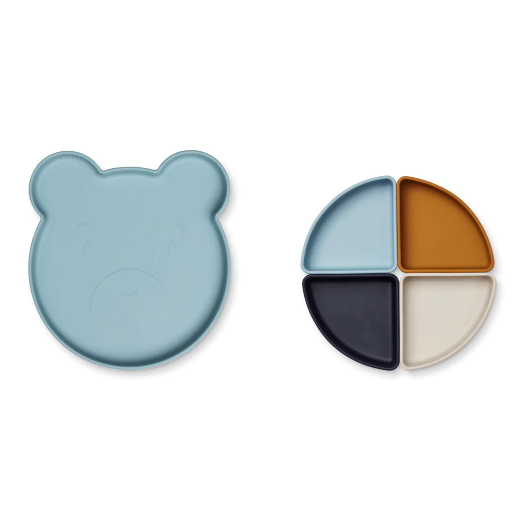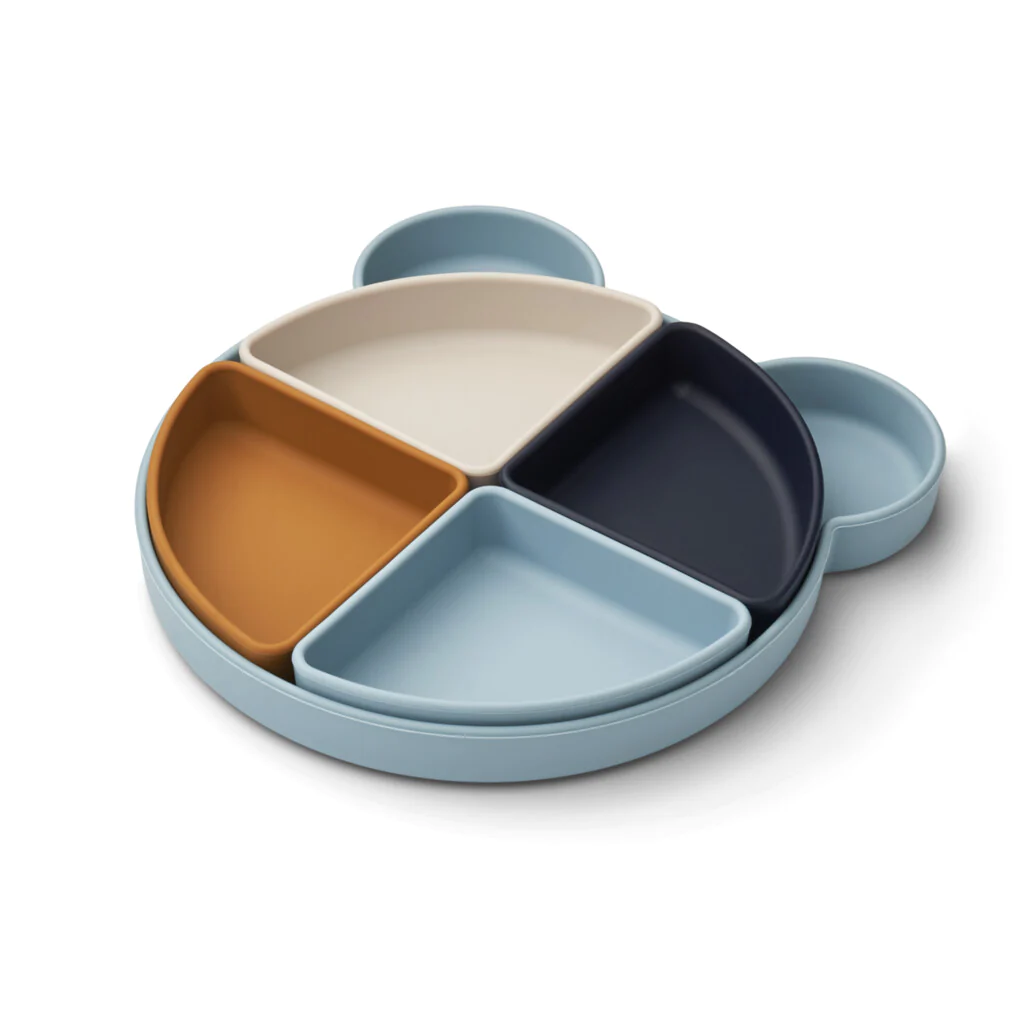 Pride čas, ko ne veste kako uvesti novo hrano na jedilnik vašega malčka. Z nekaj iznajdljivosti in prikupno razporejenega krožnika se lahko predstavitev nove jedi lažje predstavi. Silikonski krožnik v obliki ljubke živali vsebuje 4 razdelilnike, ki se lahko postrežejo posebej ali kot celota na krožniku. Pustite otroku, da si sam organizira hrano na krožniku tako, kot si želi. Krožnik in štiri posodice so izdelani iz 100% silikona, ki omogoča, da se stvari ob morebitnem padcu na tla ne zlomijo. Krožnik in posodice imajo zavihane robove, ki pomagajo, da otroci lažje zajemajo hrano.